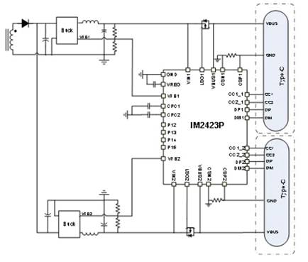芯片內(nèi)置Flash,支持在線升級;同時(shí)內(nèi)置FB直驅(qū)電路、2路P-Mos驅(qū)動(dòng)、VIN/VBUS電壓泄放通路;4個(gè)GPIO,支持 IIC,UART等,進(jìn)一步優(yōu)化外圍設(shè)計(jì)電路。IM2423P引腳高耐壓,其中CC Pin耐壓達(dá)30V,同時(shí)具有CC OVP,DP/DM OVP, OCP, OTP等多種保護(hù),可靠性更高。