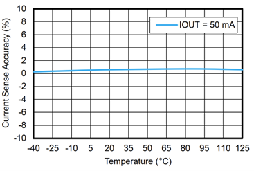 TPS42S40Q提供出色的電流檢測精度。對于1A及以上負(fù)載,檢測精度為3%,如圖1所示;而對于50mA及以上負(fù)載,檢測精度為7%,如圖2所示。精準(zhǔn)的電流感應(yīng)能力可輕松識別負(fù)載狀態(tài)和測量負(fù)載電流。