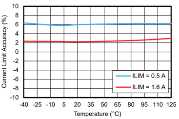 TPS42S40Q在Vs=13.5V的運(yùn)行條件下,能夠提供非常精準(zhǔn)的電流限制功能。當(dāng)電流限制閾值設(shè)定在0.5A時,全溫范圍內(nèi)限制精度可達(dá)±20%;電流限制閾值設(shè)定在1.6A時,全溫范圍內(nèi)限制精度則為±14%,如圖3所示。