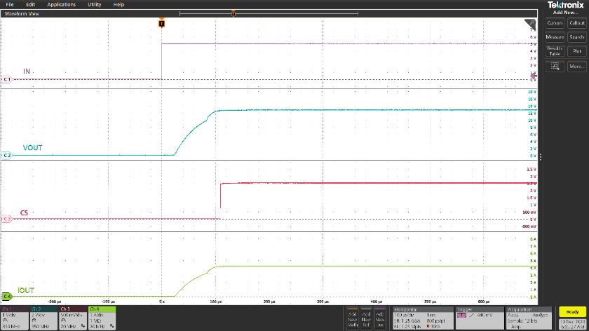 TPS42S40Q在VS=13.5V,IOUT=4A,CS=300ohm,IN start-up的運(yùn)行條件下,輸入啟動后,對啟動過程進(jìn)行斜率匹配,將斜率控制在±0.15V/μs,輸出電壓和電流在110μs達(dá)到穩(wěn)態(tài),實現(xiàn)穩(wěn)定輸出。如圖6所示。