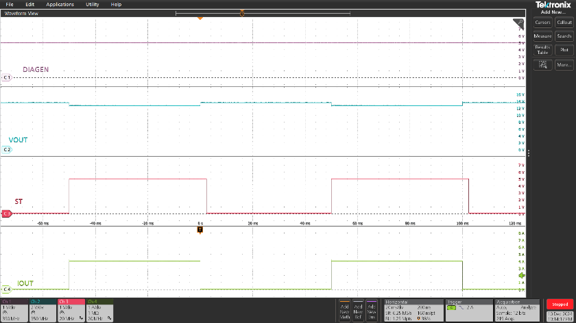 TPS42S40Q在VS=13.5V時,當(dāng)負(fù)載跳變,IOUT在1A到4A之間跳變,輸出電壓波動范圍在1V以內(nèi),且快速達(dá)到穩(wěn)態(tài),如圖7所示。