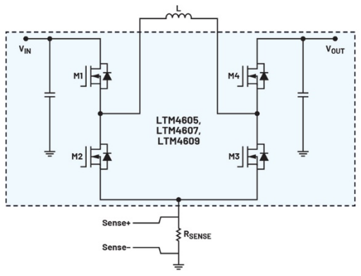 2023年,ADI發(fā)布了新款大電流、四開關降壓-升壓穩(wěn)壓器LTM4712。這是一款36 VIN(最大值)、12 A功率模塊,采用高密度16 mm × 16 mm × 8.34 mm BGA封裝。它采用ADI專有的先進組件封裝技術,將高性能功率電感集成到封裝中。圖3顯示了該模塊中集成的專有電流檢測方案。這不僅節(jié)省了空間,而且還有效減少了額外的功率損耗。該器件采用先進的降壓-升壓控制器和高級ADI封裝,能夠在寬輸入輸出電壓范圍內(nèi)實現(xiàn)超高的功率水平、功率密度、效率和出色的熱性能。