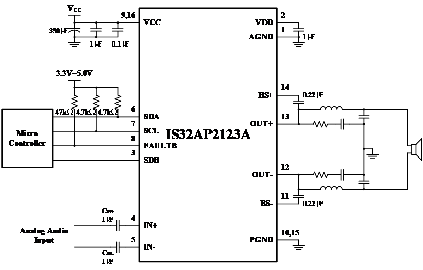 面對(duì)日益復(fù)雜的車載系統(tǒng)需求,絡(luò)明芯推出了一款符合AEC-Q100車規(guī)認(rèn)證的高性能、高可靠性、低功耗、大功率的單聲道D類音頻功放芯片IS32AP2123A。該芯片高達(dá)24W輸出功率,高信噪比,完善的故障檢測(cè)機(jī)制,以及創(chuàng)新的基于自動(dòng)增益控制(AGC)的輸出功率限制功能,不僅能保護(hù)揚(yáng)聲器,又能保證輸出音量和音質(zhì),非常適合AVAS應(yīng)用。IS32AP2123A典型應(yīng)用電路如圖2。
