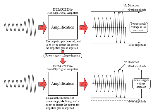 自動(dòng)增益控制(AGC): IS32AP2123A創(chuàng)新的自動(dòng)增益控制功能(AGC),可根據(jù)不同揚(yáng)聲器型號(hào)限制輸出功率,以防止揚(yáng)聲器因功率過大而受損。當(dāng)輸出功率超過選定的功率限制水平時(shí),自動(dòng)增益控制(AGC)功能將被激活,放大器的增益會(huì)降低,從而使輸出功率回到限制值以下。相比其他廠家產(chǎn)品簡(jiǎn)單的輸出功率限制功能不同,IS32AP2123A的AGC控制功能在限制功率的同時(shí),不會(huì)導(dǎo)致輸出音頻信號(hào)出現(xiàn)削波,音質(zhì)不會(huì)受到影響。