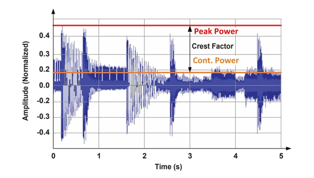 首先需要明確兩個術(shù)語:峰值功率和連續(xù)功率。峰值功率是最大瞬時音頻功率。它將決定電源可實(shí)際輸出的功率大小。連續(xù)功率是指一段時間內(nèi)的平均音頻功率。在電源設(shè)計中,連續(xù)功率是指系統(tǒng)在不超過元件溫度或平均電流額定值的情況下可以提供的特定輸出功率。圖 1 提供了峰值和連續(xù)音頻級別的示例。它們與波峰因數(shù)(波形的峰值與均方根 (RMS) 值之比的度量)有關(guān)。