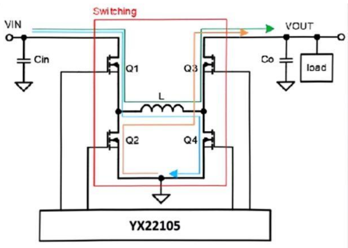 YX22105 能夠根據(jù)輸入輸出電壓自適應(yīng)的進(jìn)入降壓,升壓,升降壓模式;同時(shí)保證模式切換時(shí)具有優(yōu)異的暫態(tài)性能,使輸出的過沖、跌落風(fēng)險(xiǎn)降到最低。