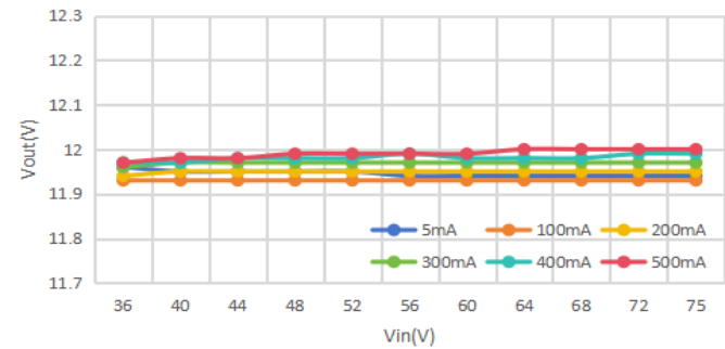 優(yōu)異的負(fù)載/線性調(diào)整率(Input:36~75V; Output:12V)