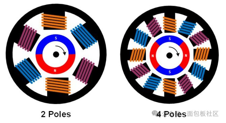 三相電機可以構(gòu)建不同的磁配置,稱為磁極。最簡單的三相電機有兩個磁極:轉(zhuǎn)子只有一對磁極,一個N極,一個S極。當然也可以有更多的磁極,這需要在轉(zhuǎn)子中配置更多的磁性部分,并在定子中增加更多繞組。磁極越多,性能越高,但極數(shù)少可以實現(xiàn)更高的速度。
