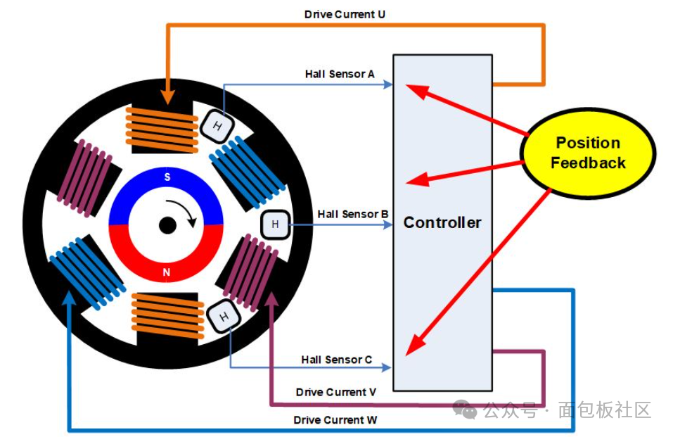 要適當?shù)匦D(zhuǎn)磁場,控制電子設(shè)備需要知道轉(zhuǎn)子上的磁體相對于定子的物理位置。通常,這個位置信息通過安裝在定子上的霍爾傳感器獲得。當磁性轉(zhuǎn)子旋轉(zhuǎn)時,霍爾傳感器會拾取轉(zhuǎn)子的磁場。驅(qū)動電子設(shè)備利用該信息,使電流按順序流過定子繞組以使轉(zhuǎn)子旋轉(zhuǎn)。