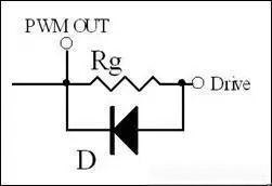 以上討論的是MOSFET ON狀態(tài)時電阻的選擇,在MOSFET OFF狀態(tài)時為了保證柵極電荷快速瀉放,此時阻值要盡量小。通常為了保證快速瀉放,在Rg上可以并聯(lián)一個二極管。當(dāng)瀉放電阻過小,由于走線電感的原因也會引起諧振(因此有些應(yīng)用中也會在這個二極管上串一個小電阻),但是由于二極管的反向電流不導(dǎo)通,此時Rg又參與反向諧振回路,因此可以抑制反向諧振的尖峰。
