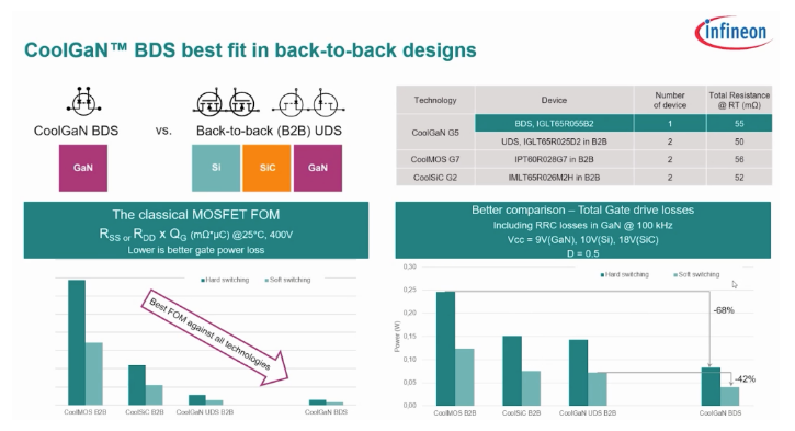 圖2:與SI和SIC MOSFET背對背配置的HV Coolgan BDS設(shè)備的損耗比較(來源:Infineon Technologies)