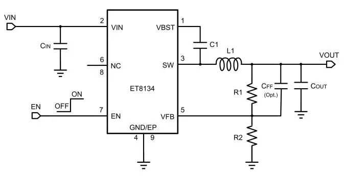 ET8134采用自適應(yīng)恒時(shí)(ACOT)結(jié)構(gòu),具有快速的瞬態(tài)響應(yīng)能力。為保持高效率,在輕載工作時(shí),ET8134工作在PFM(脈沖調(diào)頻)模式下,隨著負(fù)載電流的增大,ET8134能夠從PFM無縫切換至PWM(脈沖寬度調(diào)制)模式,從而整個(gè)負(fù)載范圍內(nèi)都能保持高效率。