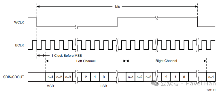 下圖是TLV320AIC3101的I2S工作時(shí)序圖。在I2S標(biāo)準(zhǔn)中,數(shù)據(jù)在WCLK邊沿(上升沿或下降沿)延遲1個(gè)時(shí)鐘周期(BCLK)后開始傳輸下一個(gè)聲道的MSB數(shù)據(jù)位。
