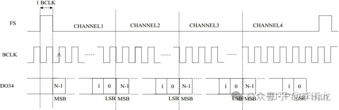 如上所述,一路I2S接口只能以左右聲道的方式用于傳輸兩路獨(dú)立的音頻數(shù)據(jù),形成雙聲道立體聲的音頻效果。但是很多時(shí)候我們的產(chǎn)品(例如包含麥克風(fēng)陣列的功能)想要傳輸更多路獨(dú)立音頻流的時(shí)候,除了使用多路獨(dú)立的I2S接口以外,還可以使用TDM接口來(lái)解決這個(gè)問題。