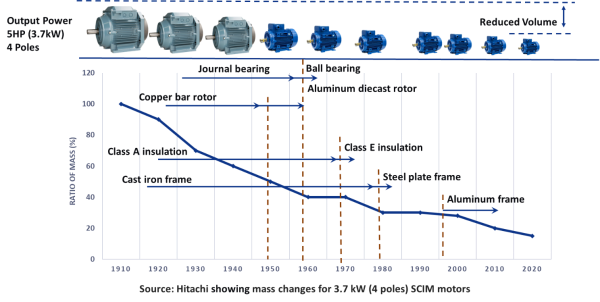 從滑動(dòng)軸承到滾動(dòng)軸承的轉(zhuǎn)型,對(duì)降低摩擦、提高精度從而提升電機(jī)效率起到了關(guān)鍵作用。過去一個(gè)世紀(jì)以來,電機(jī)在保持相同功率輸出的前提下實(shí)現(xiàn)了顯著小型化。以現(xiàn)代5馬力鼠籠式轉(zhuǎn)子三相感應(yīng)電機(jī)(SCIM)為例,其體積大幅縮小,重量?jī)H為1910年同功率電機(jī)的20%左右。這種尺寸縮減得益于更輕量化高效材料的應(yīng)用,以及熱絕緣和電絕緣技術(shù)的進(jìn)步。更輕巧的電機(jī)對(duì)汽車應(yīng)用尤為有利——既可通過減重提升能效,又能將電機(jī)集成到更緊湊的空間。這些技術(shù)進(jìn)步的影響深遠(yuǎn),造就了能效更高、性能更優(yōu)且更節(jié)能的電機(jī)系統(tǒng)。