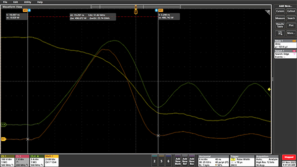 圖 1 導(dǎo)通示例:Ch1 漏極-源極電壓、Ch4 漏極電流,Math耗散功率