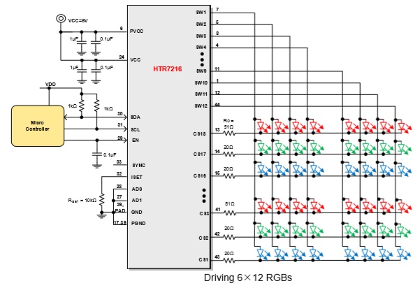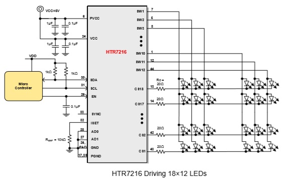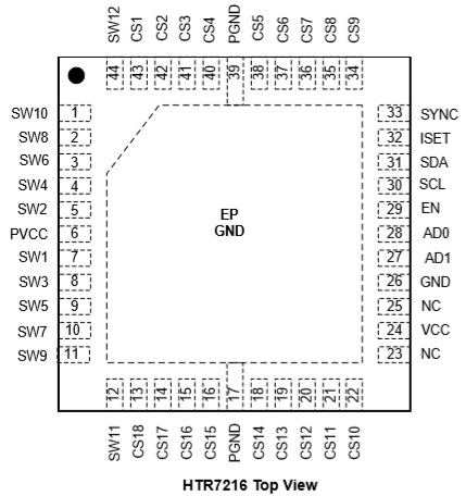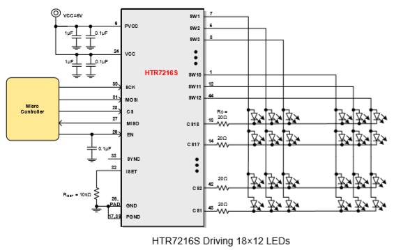 HTR7216(S)是一款通過1MHz的I2C接口 (HTR7216)或10MHz SPI接口(HTR7216S)進行編程的支持18×12陣列的LED驅動芯片,每路SWx都支持8位PWM數據進行獨立調光,并且每路CSx都有8位的直流掃描數據用來支持每個點的256階的線性PWM調光,并且每個CSx都支持256階的直流電流可調節(jié)等級。