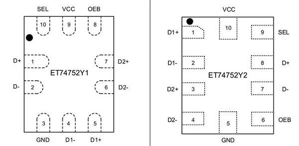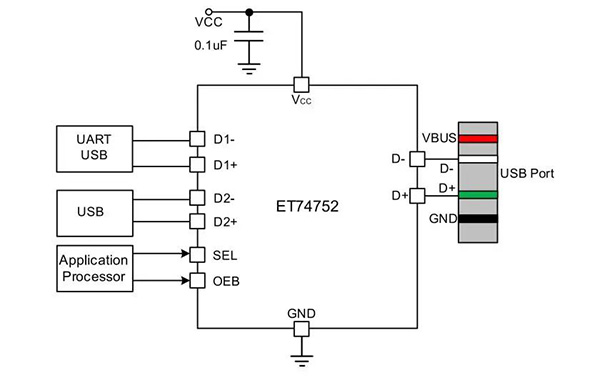 ET74752是力芯微推出的高性能DPDT USB 2.0開關(guān)芯片,集成過壓保護(hù)(OVP)和浪涌防護(hù)功能,專為智能設(shè)備接口安全設(shè)計。支持480Mbps高速傳輸,帶寬達(dá)1GHz(單端)。其核心優(yōu)勢在于多重保護(hù)機制:當(dāng)檢測到D+/D-引腳電壓超過5.1V時,OVP功能自動切斷通路,可耐受24V DC輸入;同時支持35V浪涌防護(hù),有效保護(hù)下游電路。