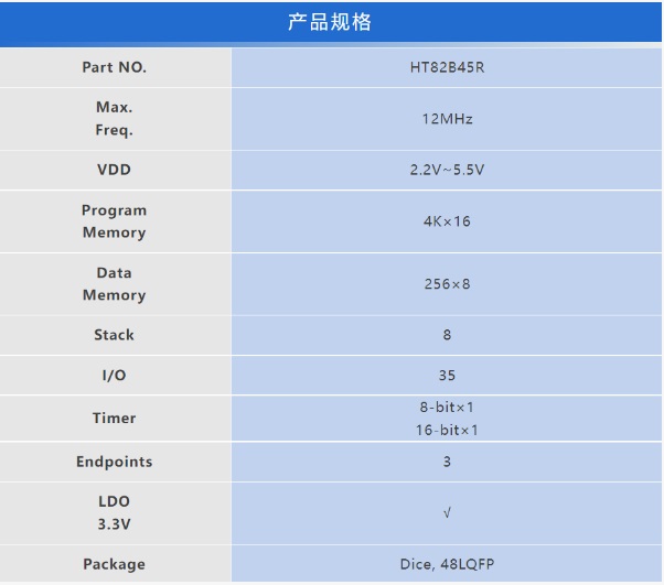 HT82B45R工作電壓2.2V~5.5V,系統(tǒng)頻率為內(nèi)建12MHz振蕩器,有效簡化外圍元件。產(chǎn)品規(guī)格包含有4K × 16 OTP ROM、256 Bytes RAM、低速USB、3個Endpoints、最多35個雙向I/O、1組8-bit Timer、1組16-bit Timer以及內(nèi)建3.3V LDO提供USB所需電壓,USB模式下內(nèi)部12MHz 振蕩器的精準度可達到±1.5%。提供Dice與48-Pin LQFP封裝形式選擇。