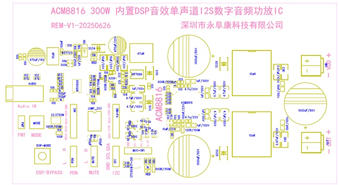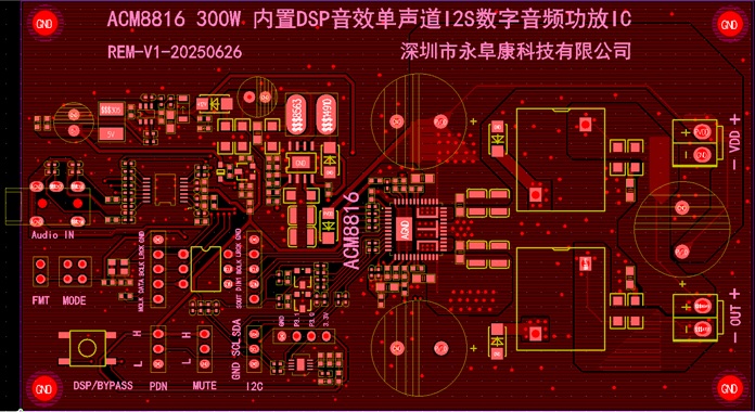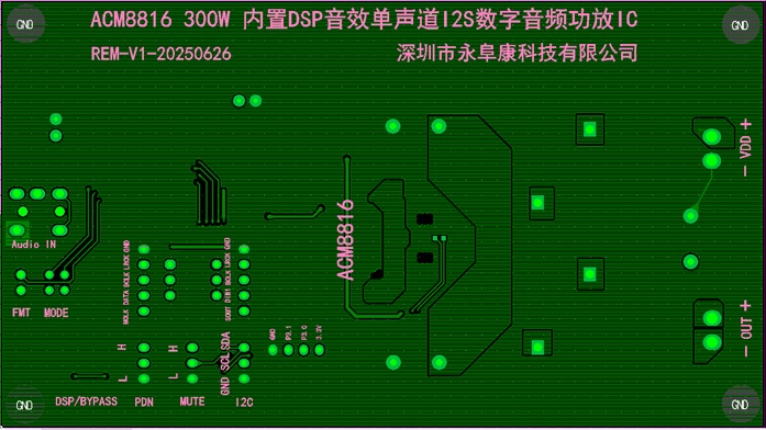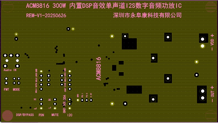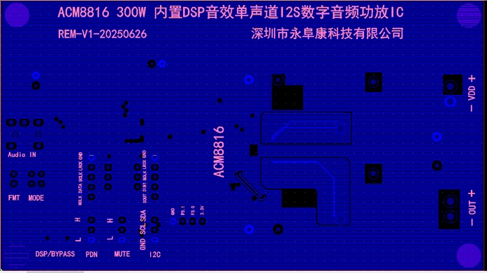 ACM8816是一款集成GaN HEMT的器件,高效、高性能具有I2S數字輸入的單聲道D類音頻放大器。外圍應用電路只需要很少的無源元件,能在4.5V至50V寬輸入電源工作。ACM8816集成7mΩRdson-GaN-HEMT,驅動到4Ω可以在10%THD+N內輸出1×340W的功率,而不需要散熱器。