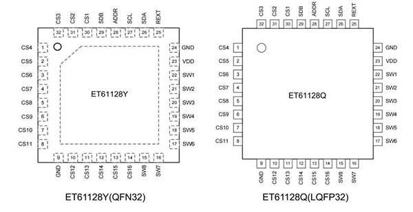 ET61128采用標(biāo)準(zhǔn)I²C接口,支持400KHz高速通訊,具備連續(xù)讀寫功能,4個(gè)片地址可選,方便多設(shè)備協(xié)同工作。芯片內(nèi)部集成開(kāi)短路檢測(cè)、軟硬件關(guān)斷、擴(kuò)頻及消隱功能,確保系統(tǒng)穩(wěn)定運(yùn)行,延長(zhǎng)LED壽命。靜態(tài)電流低至3mA,關(guān)斷模式功耗僅3uA,延長(zhǎng)電池設(shè)備續(xù)航。封裝采用QFN32(4mm×4mm)和LQFP32(7mm×7mm),可適應(yīng)不同空間需求。