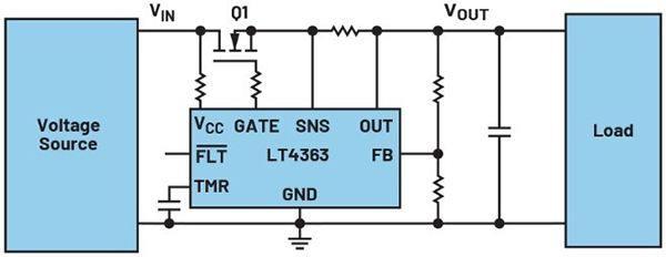 LT4363浪涌保護器件不僅會考慮流過MOSFET的電流大小,還會考慮源極和漏極之間施加的電壓。如此一來,MOSFET能夠在線性模式下更安全地運行,而且也許能夠選擇尺寸更小的MOSFET,進而降低系統(tǒng)成本。