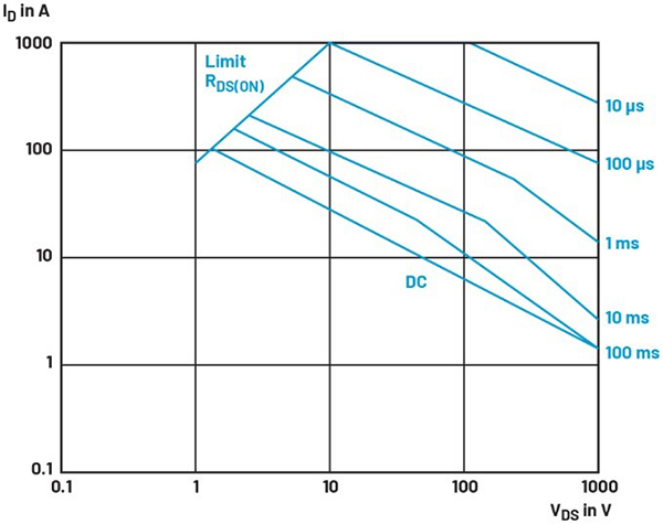 圖2顯示了MOSFET的典型安全工作區(qū)(SOA)曲線。SOA曲線定義了器件在不同電壓降下可承載的電流大小,以及能夠持續(xù)承載該電流的時長。如果希望有更大的電流長時間流過MOSFET,就必須選擇SOA范圍更大的MOSFET。SOA的范圍越大,MOSFET的尺寸也就越大。這同樣會增加元件的成本。