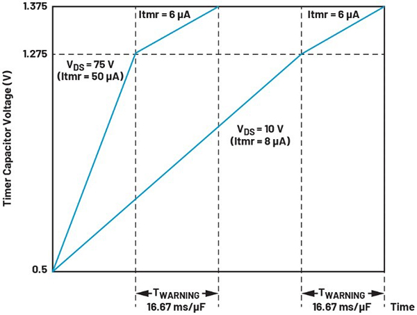 這種保護機制的工作原理是,根據(jù)所測量的電流和壓降,對圖1中TMR引腳上的定時電容器進行充電。如果電容器上的電壓上升到1.275 V以上,就會發(fā)出警告。而當電壓高于1.375 V時,MOSFET會完全關斷,以實施保護。