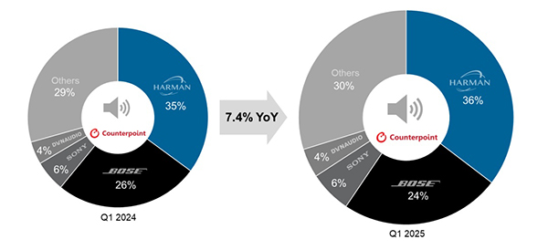 市場研究機(jī)構(gòu) Counterpoint 咨詢發(fā)布報告,目前全球乘用車音響系統(tǒng)市場由 Harman 和 Bose 主導(dǎo),兩家廠商合計貢獻(xiàn)近 60% 的總銷售額。