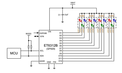 ET6312B 采用 I²C 總線接口,通過(guò)九個(gè)內(nèi)部寄存器可靈活配置呼吸周期、延遲時(shí)間、電流等級(jí)等參數(shù),EXPWM 引腳還支持外部 PWM 輸入擴(kuò)展控制。這款集成溫度保護(hù)與超低壓差特性的驅(qū)動(dòng)芯片,以 QFN20小巧封裝,為多通道 LED 控制系統(tǒng)提供高效穩(wěn)定的解決方案。