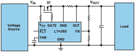 LT4363浪涌保護(hù)器件不僅會(huì)考慮流過MOSFET的電流大小,還會(huì)考慮源極和漏極之間施加的電壓。如此一來,MOSFET能夠在線性模式下更安全地運(yùn)行,而且也許能夠選擇尺寸更小的MOSFET,進(jìn)而降低系統(tǒng)成本。