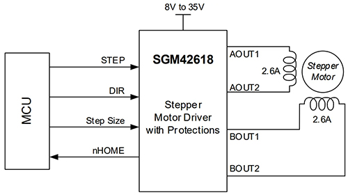 在技術(shù)規(guī)格方面,SGM42618 的電機電源電壓范圍為 8V 至 35V,每個繞組的電流可高達 2.6A。+25℃ 環(huán)境溫度下導通電阻僅為