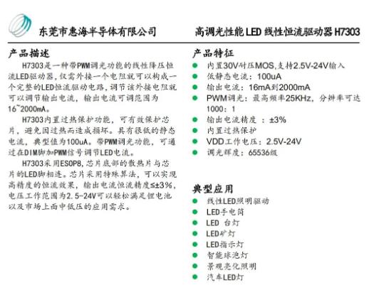 惠海半導(dǎo)體推出的DC-DC降壓型線性恒流調(diào)光芯片H7303系列專為高調(diào)光性能、低成本的LED調(diào)光需求設(shè)計(jì)。下文為該系列芯片的一個(gè)簡(jiǎn)單介紹,更多的應(yīng)用資料及產(chǎn)品規(guī)格書(shū)請(qǐng)到惠海半導(dǎo)體官網(wǎng)。