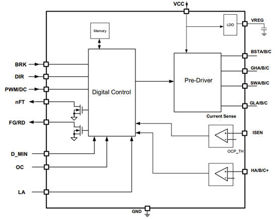 18V、3A三相無刷無感驅(qū)動(dòng)、180˚正弦,集成驅(qū)動(dòng)算法+預(yù)驅(qū)+MOS |