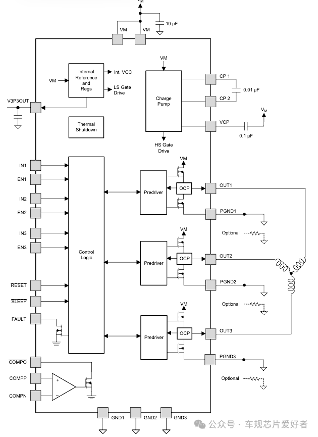 18V、3A三相無刷無感驅(qū)動、180˚正弦,集成驅(qū)動算法+預(yù)驅(qū)+MOS |