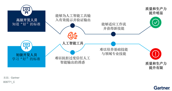 高級和初級開發(fā)人員受生成式AI的影響程度不同。為彌合這一差距,團(tuán)隊(duì)需要進(jìn)行結(jié)構(gòu)化培訓(xùn)、指導(dǎo)和同行學(xué)習(xí)。圖1突出顯示了AI對不同經(jīng)驗(yàn)和專業(yè)知識水平的員工的差異化影響。