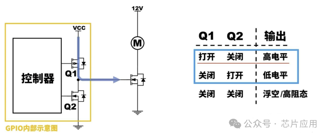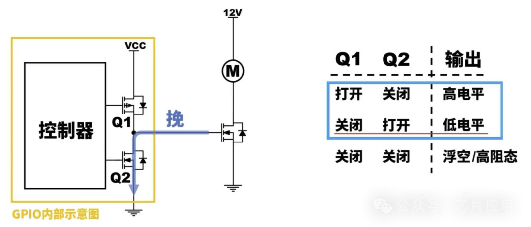 如下圖,當(dāng)我們外接一個(gè) MOS 管時(shí),輸出高電平,電流流出去給外面的 MOS 管的柵極充電,所以這個(gè)過程稱為推。把電流推出去。