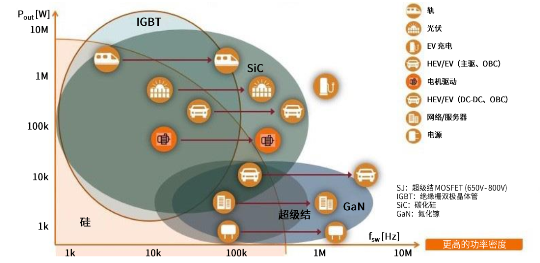 下圖顯示了各種高功率主流應(yīng)用優(yōu)先考慮使用的開關(guān)。紅色箭頭顯示, 許多功率超過 ~10kW 的應(yīng)用正在從 IGBT 轉(zhuǎn)向更快的碳化硅 (SiC) 開關(guān)。 更快速的開關(guān)可帶來更高的功率密度。