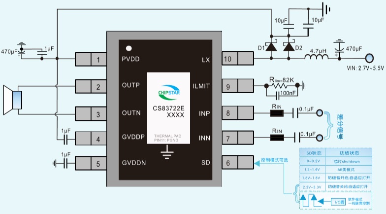 CS83722E的全差分架構(gòu)和極高的PSRR有效地提高對RF噪聲的抑制能力。無需濾波器的PWM調(diào)制結(jié)構(gòu)及內(nèi)置的BOOST升壓模塊 ,以及CS83722E采用專有的AERC(Adaptive Edge Rate Control)技術(shù),在音頻全帶寬范圍內(nèi)極大地降低了EMI的干擾,對60cm的音頻線 ,在FCC的標(biāo)準(zhǔn)下具有超過20dB的裕量,另外CS83722E內(nèi)置了過流保護(hù),短路保護(hù)和過熱 保護(hù),有效的保護(hù)芯片在異常的工作條件下不被損壞。