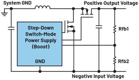 然而,有時電壓需要反相。在大多數情況下,需要將正電源電壓轉換為負電壓。這是為了給信號路徑中的傳感器供電,使其能夠處理具有正負電壓偏轉的信號。例如,+5V和-5V用作運算放大器的電源,以處理信號電壓。某些應用需要負電壓來安全關斷MOSFET的柵極。要從現有正電壓產生負電壓,圖1所示的反相拓撲是合適的方案。其中,正電壓被轉換為負電壓。這種電路結構簡單,不需要變壓器,可以利用標準降壓型開關穩(wěn)壓器IC構建。降壓型穩(wěn)壓器的輸出電壓連接至系統(tǒng)接地端,GND引腳電壓產生負電壓,該負電壓可通過電阻分壓器Rfb1和Rfb2進行調節(jié)。