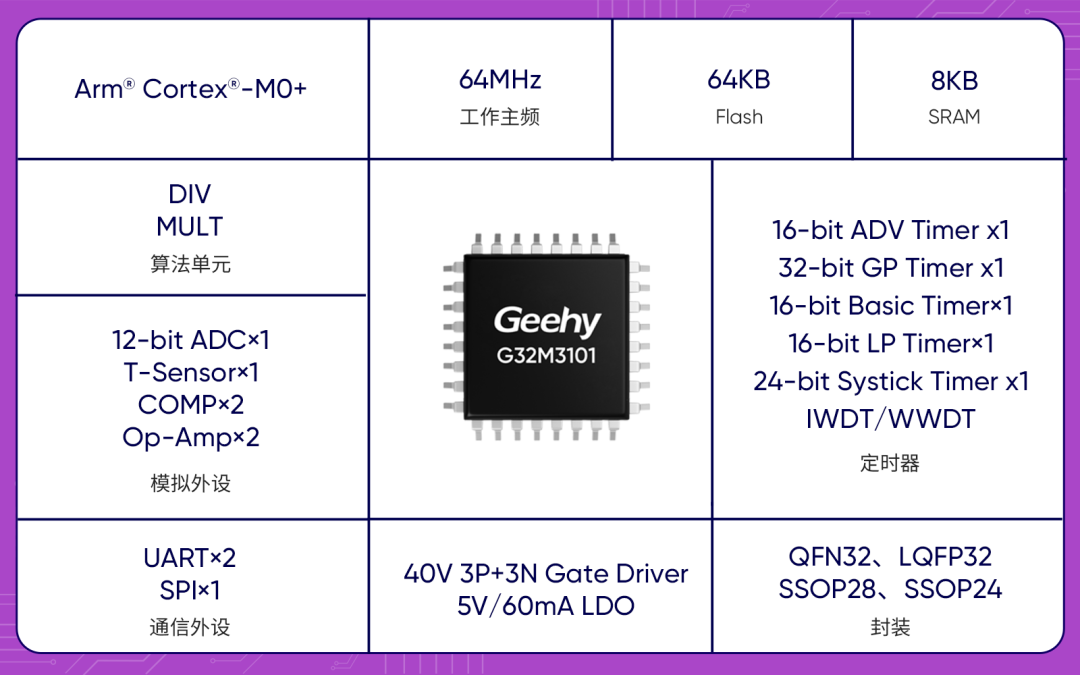 G32M3101系列搭載Arm® Cortex®-M0+內(nèi)核,主頻64MHz,F(xiàn)lash 64KB,SRAM 8KB,為電機(jī)控制應(yīng)用提供高效的處理性能;內(nèi)置DIV/MULT算法單元加速,可高效實(shí)現(xiàn)有感/無感FOC算法控制。集成40V 3P+3N柵極驅(qū)動(dòng)器,內(nèi)置240ns死區(qū)時(shí)間,欠壓保護(hù)、防直通保護(hù)等多種功能,有效保障系統(tǒng)穩(wěn)定運(yùn)行;內(nèi)置5V/60mA ±0.5%高精度LDO,為內(nèi)部MCU提供電源,無需額外電源模塊。
