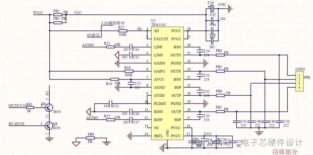 - 右聲道輸出:21腳OUTP(右聲道正輸出)和18腳OUTP(右聲道負(fù)輸出)為右聲道BTL輸出端,經(jīng)C32(224)、C33(224)濾波+FB6/FB7磁珠抗干擾后,接入CON3的另一組引腳。