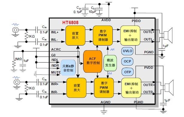 HT6808是一款具有超低EMI、防削頂失真功能的立體聲免輸出濾波器D類音頻功率放大器,在電源電壓5V、THD+N=10%、4Ω負(fù)載的條件下,輸出高達(dá)3W的功率,在提供媲美于AB類放大器性能的同時,效率高達(dá)90%。HT6808的最大特點是防削頂失真(ACF)輸出控制功能,可檢測并抑制由于輸入音樂、語音信號幅度過大所引起的輸出信號削頂失真(破音),也能自適應(yīng)地防止在電池應(yīng)用中由電源電壓下降所造成的輸出削頂,顯著提高音質(zhì),創(chuàng)造非常舒適的音樂享受,并保護(hù)揚聲器免受過載損壞。通過在ACRC端外接不同電阻電容值,可靈活設(shè)置放大器的音質(zhì)和輸出功率;同時芯片提供了ACF Off模式。HT6808采用獨有的電磁輻射(EMI)抑制技術(shù),具有超優(yōu)異的全帶寬低輻射性能,輻射水平在不加任何輔助設(shè)計時仍遠(yuǎn)遠(yuǎn)低于FCC Part15 Class B標(biāo)準(zhǔn)值,降低了系統(tǒng)電磁兼容設(shè)計難度。HT6808內(nèi)部集成免濾波器數(shù)字調(diào)制技術(shù),能夠直接驅(qū)動揚聲器,并最大程度減小脈沖輸出信號的失真和噪音。極少的外部元器件節(jié)省了系統(tǒng)空間和成本,是便攜式應(yīng)用的理想選擇。此外,HT6808內(nèi)置的關(guān)斷功能使待機(jī)電流最小化,還集成了靜音功能、左右聲道獨立關(guān)斷、揚聲器輸出端過流保護(hù)、片內(nèi)過溫保護(hù)和欠壓異常保護(hù)等功能;采用無鉛TSSOP-20和QFN-20封裝形式。
