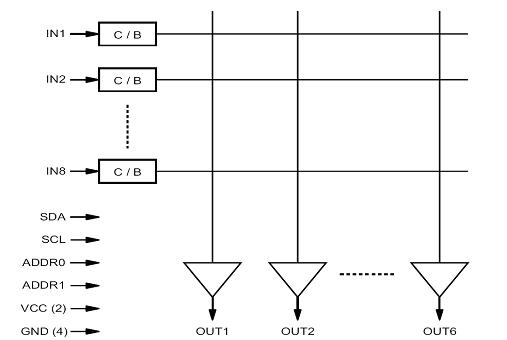 AX6502提供8個(gè)可任意連接到6個(gè)輸出的輸入端口,每個(gè)輸入都可以連接到1個(gè)或多個(gè)輸出,但是每個(gè)輸出只能連接一個(gè)輸入。AX6502的輸入提供鉗位或偏置選項(xiàng),以便處理同步或非同步的視頻信號(hào),鉗位可將輸出同步端電平設(shè)置為300 mV。而偏置選項(xiàng)則可在內(nèi)部將輸入偏置為1.25 V的非同步信號(hào)。所有的輸出用來(lái)驅(qū)動(dòng)一個(gè)150 Ω的直流負(fù)載。每個(gè)輸出可以提供0dB或6dB的信號(hào)增益。輸入到輸出線路和輸入偏置模式功能受I2C兼容數(shù)字接口控制。采用TSSOP-24封裝,管教功能完全兼容FMS6502/SGM6502。