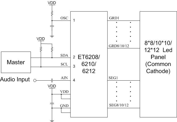 ET6208/6210/6212是一顆單片集成音頻7段圖形均衡器并可驅(qū)動8*8(ET6208),10*10(ET6210),12*12(ET6212)點陣的LED驅(qū)動電路。ET6208/6210/6212有音頻同步模式和普通模式兩種工作模式。在音頻同步模式下,通過內(nèi)置帶通濾波器把20Hz~20KHz的輸入音源信號細分為7個頻段,再通過內(nèi)置的高精度ADC把每個不同頻段的平均幅度值轉(zhuǎn)換成對應(yīng)的數(shù)字值,同時計算出音源信號的總平均幅度值,最后送到輸出顯示。在音頻同步模式下MCU無須進行任何數(shù)據(jù)操作,只需要設(shè)置相應(yīng)的指令,LED燈就可以隨著輸入音源的頻率以及強弱同步顯示7路對應(yīng)頻率的幅度,和1路總音量強弱顯示。在普通模式下,可以實現(xiàn)1/8(ET6208),1/10(ET6210),1/12(ET6212)占空比的動態(tài)LED顯示,內(nèi)置128階的亮度等級可以幫助用戶實現(xiàn)更多彩的圖案,同時還內(nèi)置了7個時間等級的自動呼吸功能。256*8bit(ET6208),256*10bit(ET6210),256*12bit(ET6212)的RAM,可以任意設(shè)置顯示RAM的首地址、顯示長度及RAM的顯示周期數(shù),在不過多占用系統(tǒng)資源的前提下大幅度增加了用戶的可編程性。工作電壓2.7V-5.5V