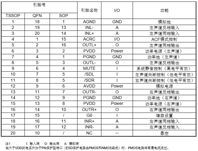 2×20W (VDD=14.5V, RL=4Ω, THD+N=1%) 或2×25W (VDD=14.5V, RL=4Ω, THD+N=10%) |