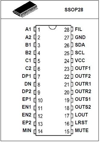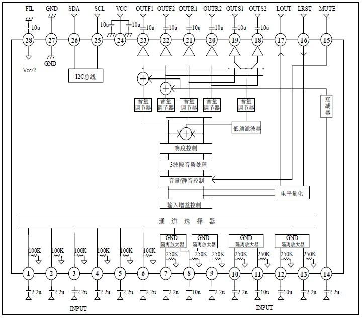 包括立體聲輸入端選擇模塊,準(zhǔn)差分輸入選擇模式及全差分輸入選擇模式;內(nèi)置輸入增益控制模塊,主音量控制模塊,響度控制,5 通道音量調(diào)節(jié)器,為重低音通道設(shè)置低通濾波器,內(nèi)置混合信號輸入端。優(yōu)化的開關(guān)控制特性,可以大大減少開關(guān)噪聲,很容易被微機(jī)控制,保證了高質(zhì)量的汽車音響系統(tǒng)。 |