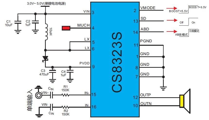 擴(kuò)頻模式,靜音功能,三種防破音模式,AB/D切換,內(nèi)置升壓,18W單聲道音頻功放 |