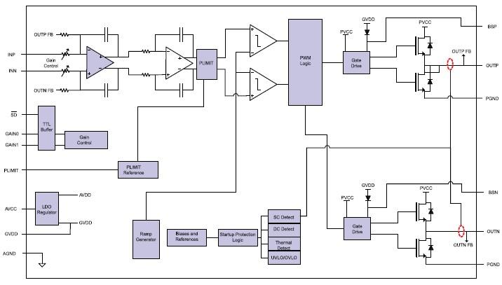 具有防破音功能的免電感濾波2×20W D類立體聲音頻功放 |