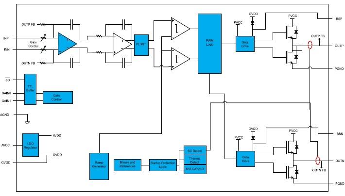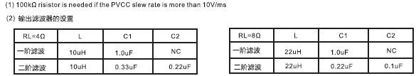 擴頻功能、低空載電流、40倍增益、免濾波、2X23W/33W(PBTL) D類音頻放大器 |